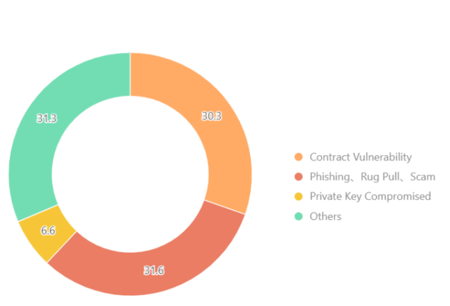Другие типы атак были нацелены на проблемы с повторным входом, манипулирование ценами и проблемы с проверкой. Кража секретных ключей происходила всего в 6,6 процентах случаев. Самыми большими потерями от кражи секретных ключей стали инциденты с Ronin и Harmony; оба случая связаны с кроссчейн-мостами.